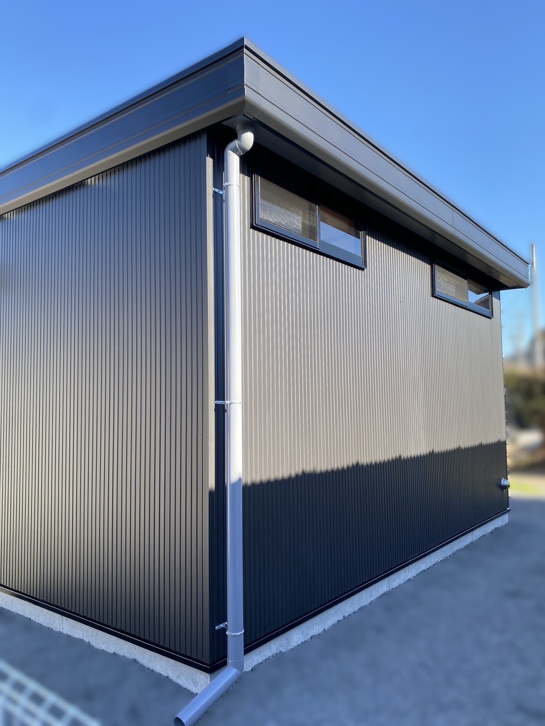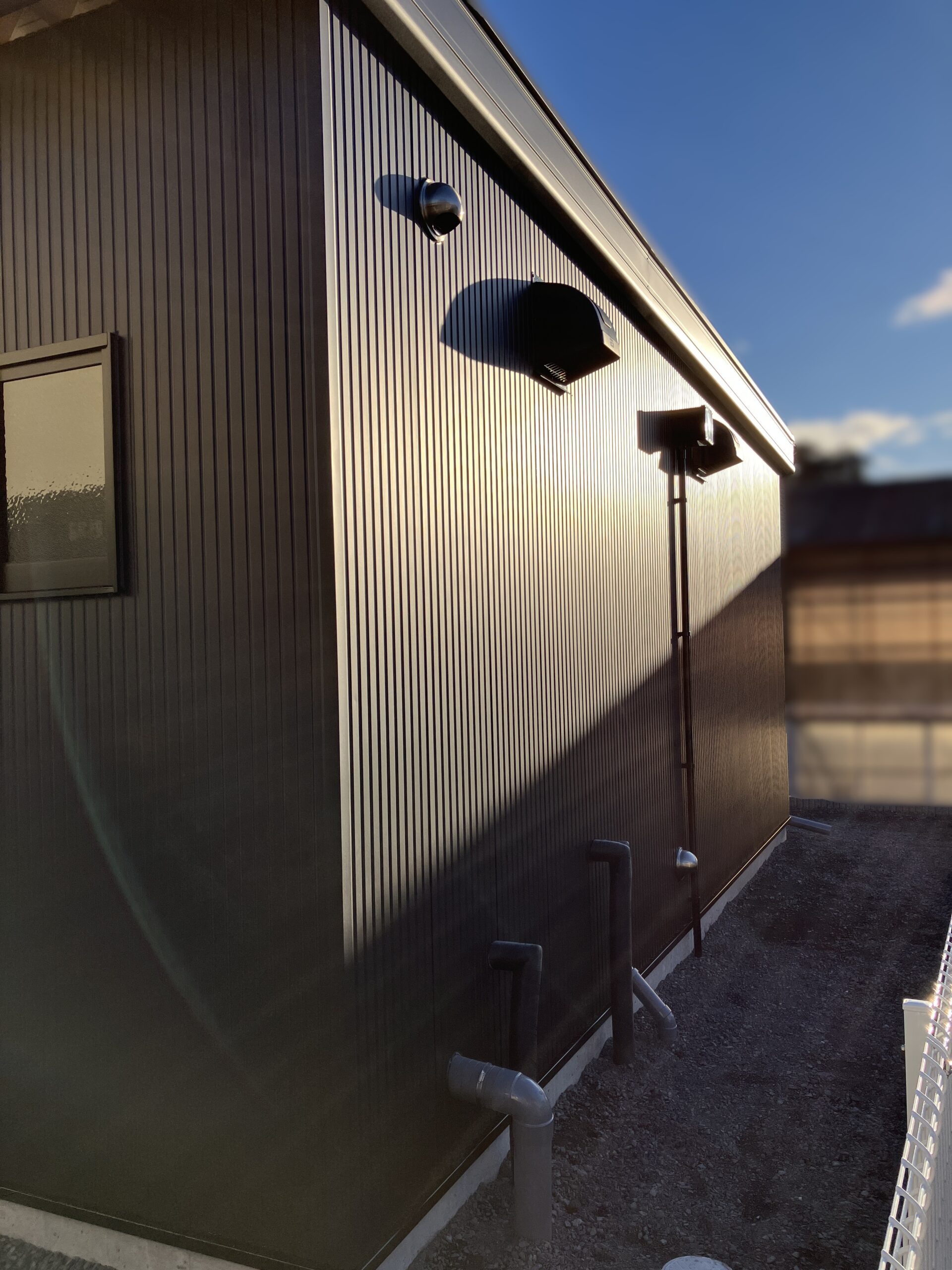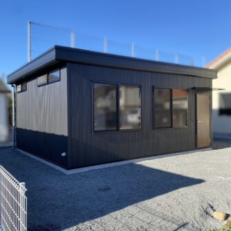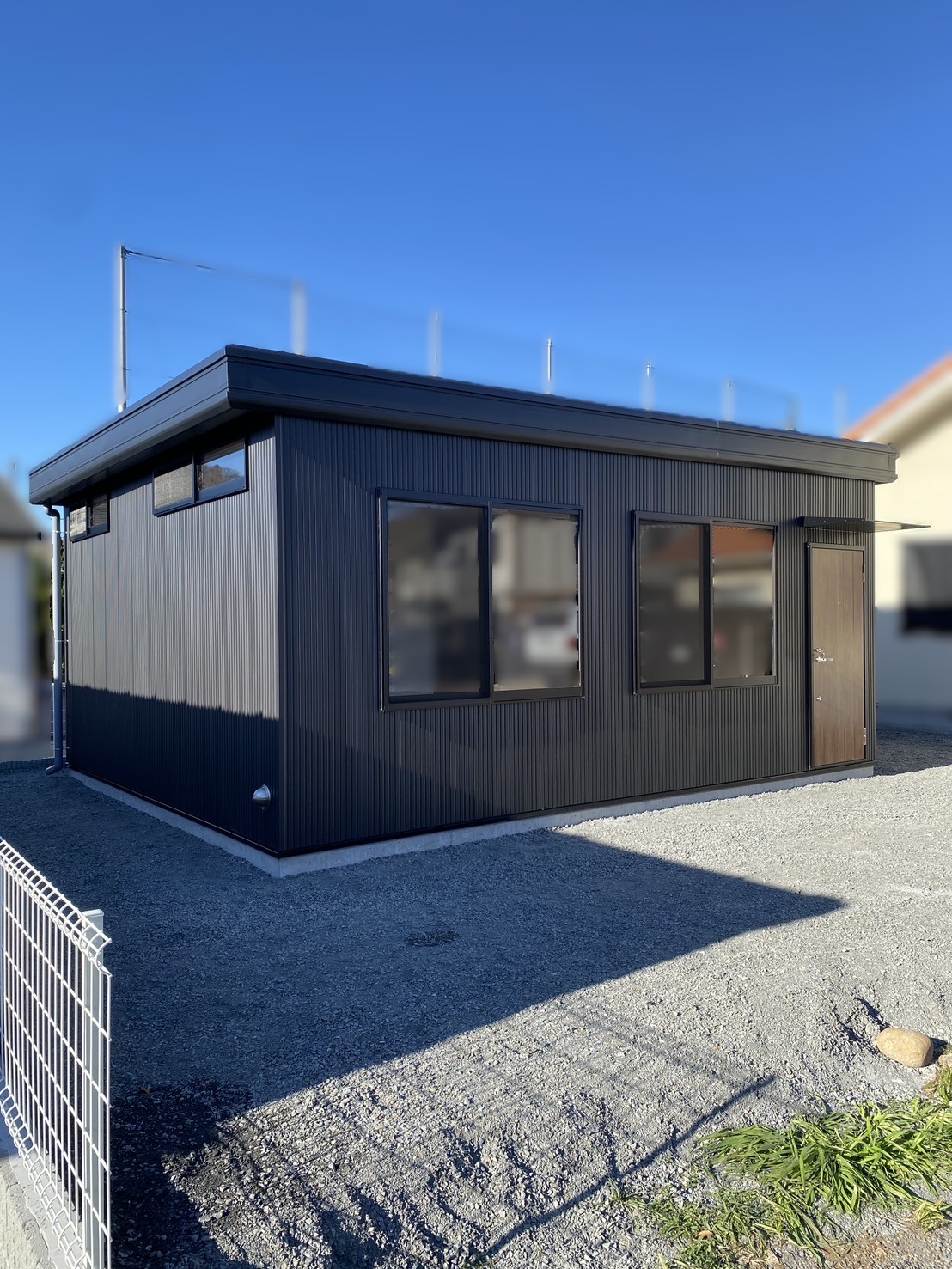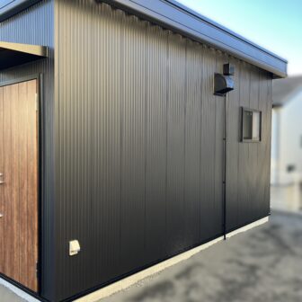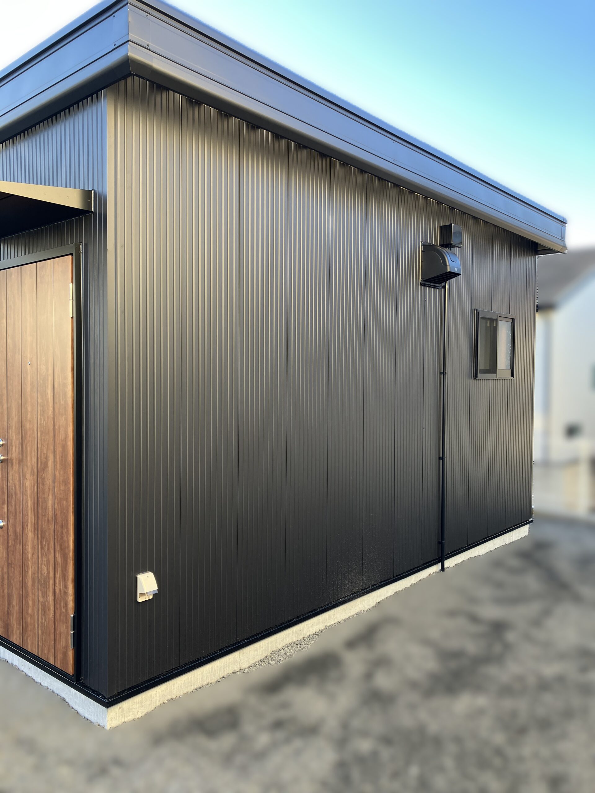 外観はお客様がデザイン性にもこだわり、外壁はブラック、ドアは木目調を採用。
